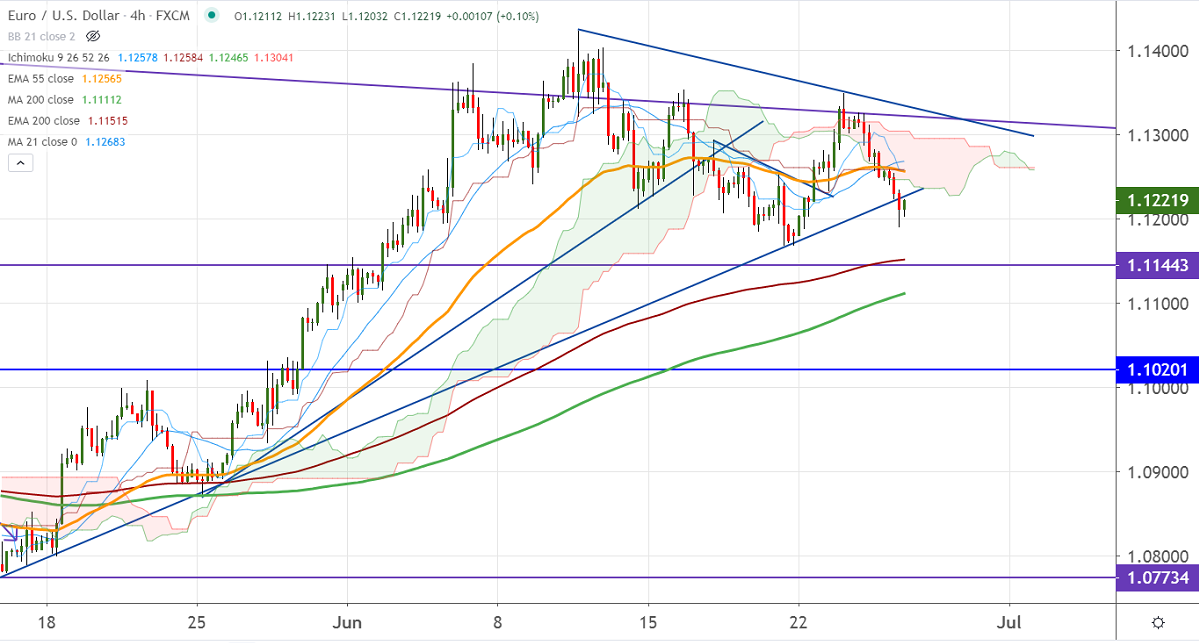 EURUSD continues to trade lower after upbeat US data. US Durable goods orders came at 15.8% much better than the forecast of 10.3%, highest level since Jul 2014. The number of people filed for unemployment benefits rose to 1.48 million last week worst than expectations of 1.35 M. The continuing jobless claims fell by 767000 to 19.52 million. It hits a low of 1.1904 and is currently trading around 1.12150.