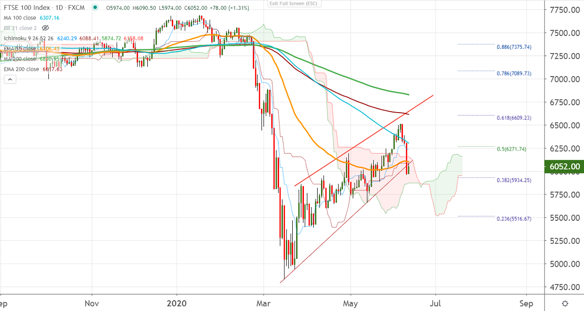 FTSE100 showed a massive decline of more than 5% on global sell-off. US Market especially Dow Jones lost more than 1800 points on increase in coronavirus case in U.S. The number of new case in Florida rose by 1698, a one day record. The UK index hits a low of 6274 and is currently trading around 6018.