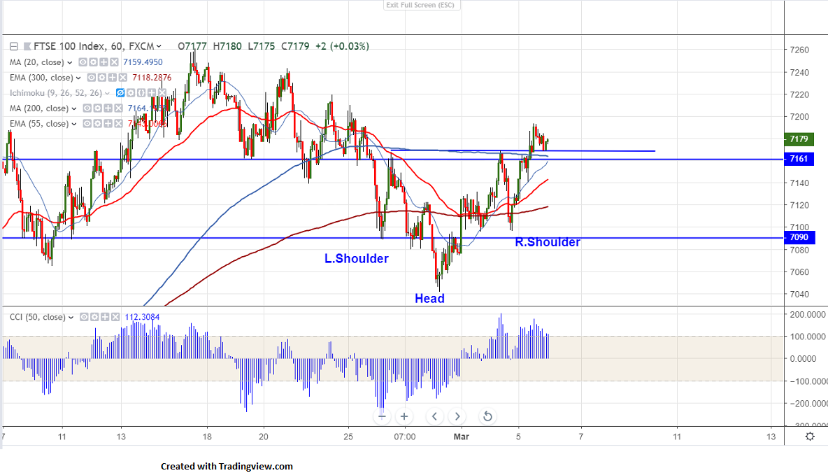 FTSE100 is trading higher for 5th consecutive day and jumped more than 150 points from low of 7042 made on Feb 28th 2019.The index has formed almost a double bottom around 7095 and shown a good recovery.It has formed temporary top around 7261 and declined sharply on GBP strength.The decline in GBP is supporting FTSE100 index currently and it has lost nearly 200 pips after forming temporary top around 1.3350 on hopes of no deal Brexit.It is currently trading around 7186.