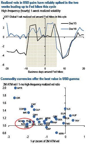 Either way, the dollar narrative is back in play after a subdued start to the year and realized vols in USD-pairs are liable to firm in coming weeks much as they have done around the last two Fed meetings that featured rate increases this cycle (refer above chart).
