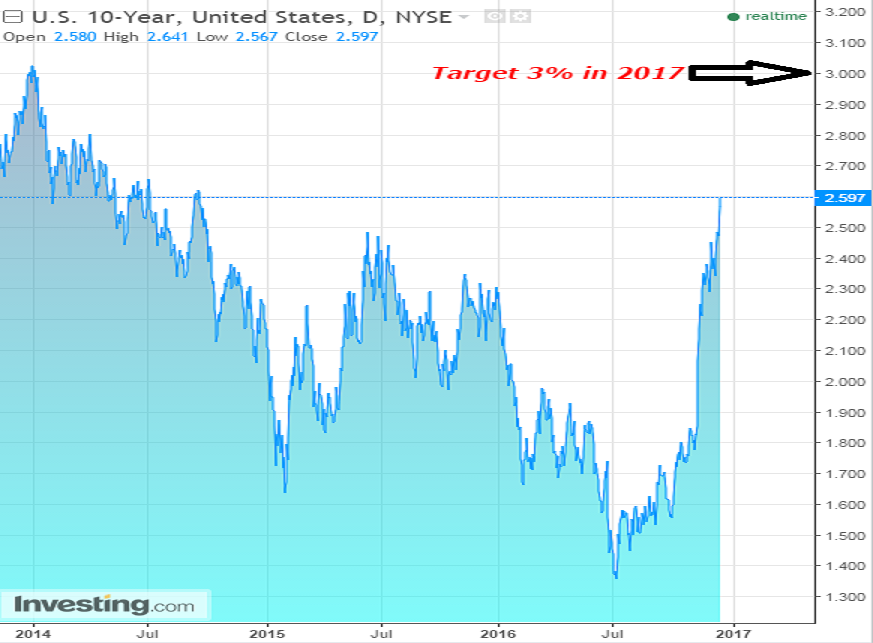 Following this news, the benchmark United States 10-year Treasury yields jumped 10 basis points to 2.62 percent, hitting highest since September 2014. Thereby, we foresee that next year the 10-year yields will likely break 3 percent mark, the highest level in three years.