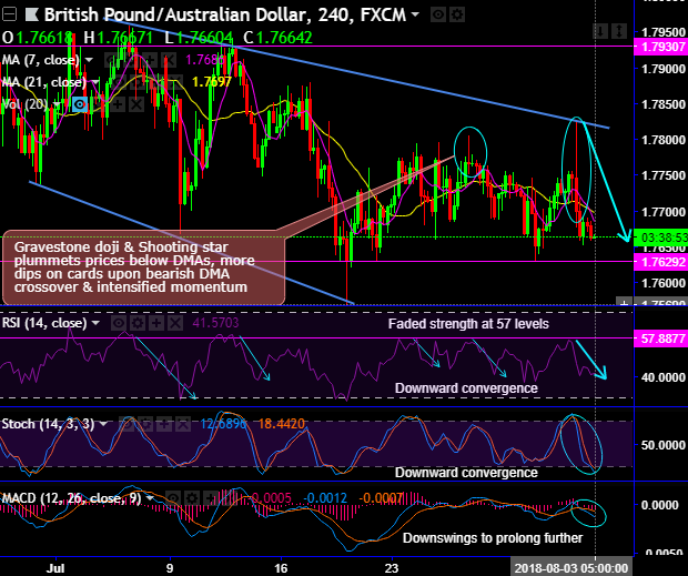 On 4H charts, the intraday trend has been sliding through sloping channel, sharp shooting star patterns pop-up at 1.7664 levels and gravestone doji at 1.7765 levels.