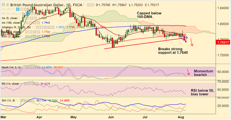 - GBP/AUD has broken out of consolidation, dips lower to break strong trendline support at 1.7640.