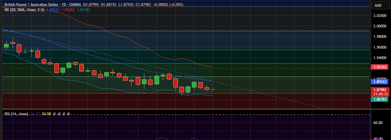 • Support is seen at 1.8722(Lower BB) and break below could take the pair towards 1.8682(Lower BB).