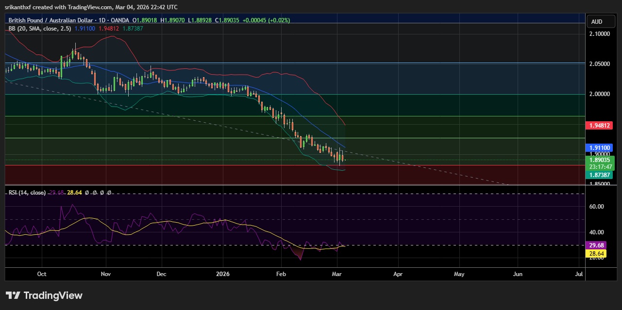• Support is seen at 1.8818(Daily low) and break below could take the pair towards 1.8738(Lower BB).