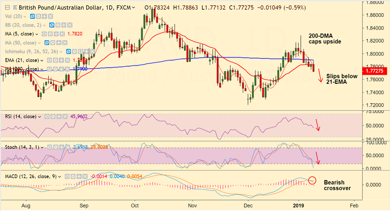 - On the flipside, strong resistance is seen at 1.7820 (nearly converged 5-DMA and 21-EMA).