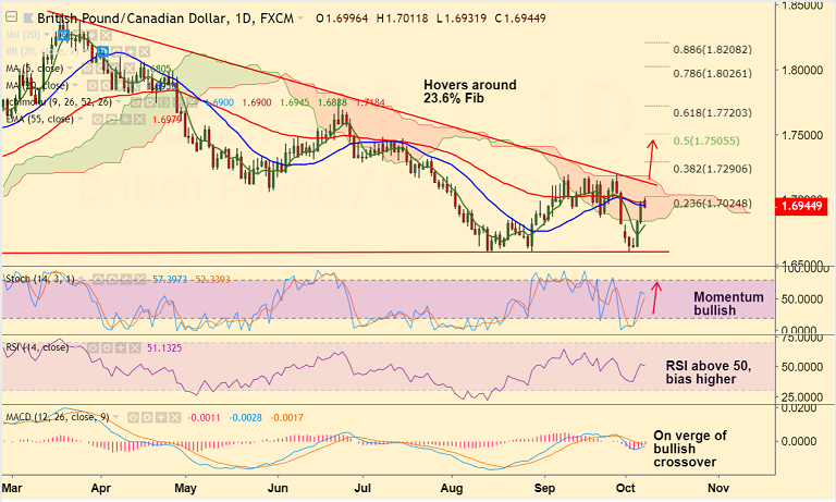 - Price action has broken above 21-EMA, tests 1.70 mark
