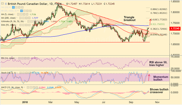Support levels - 1.72, 1.7136 (5-DMA), 1.70 (55-EMA)