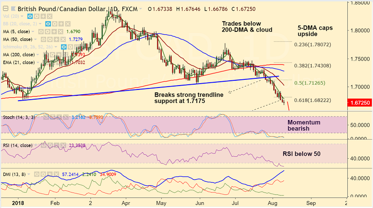 - GBP/CAD extends rout for 5th straight week, trades 0.06% lower on the day at 1.6723 at the time of writing.