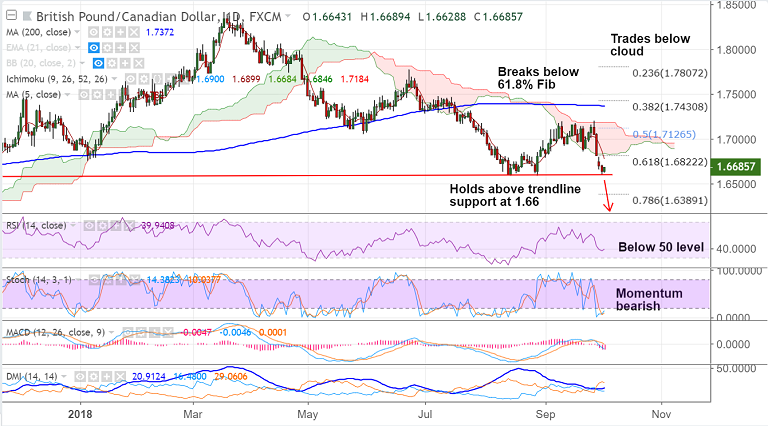- Break below strong trendline support at 1.66 will see further weakness. Scope then for test of 78.6% Fib at 1.6389.