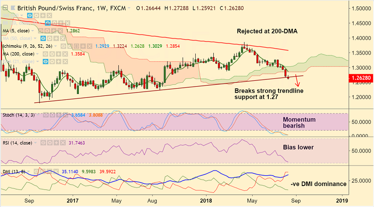 - GBP/CHF has broken strong trendline support at 1.27, bias bearish.