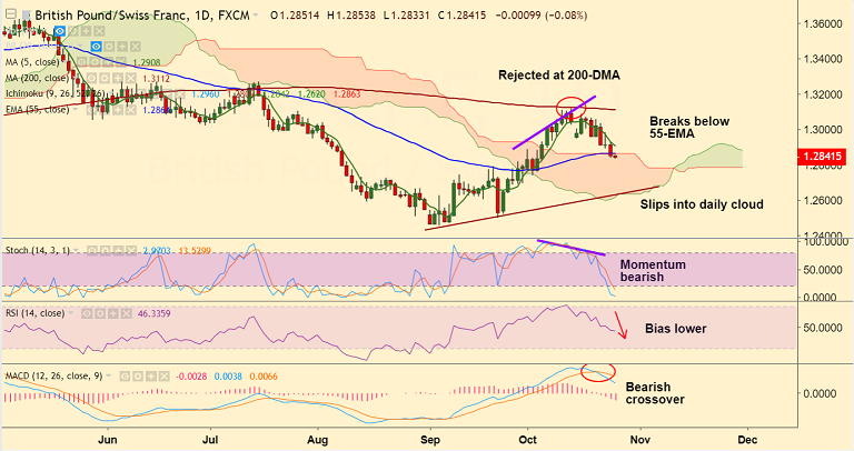 - Upside in the pair remains capped at 5-DMA which is sharply lower. Break below strong support at 55-EMA raises scope for further weakness.