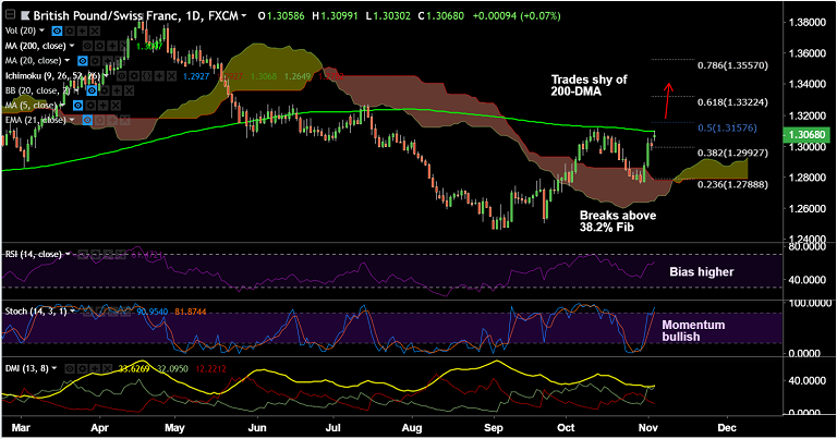 - GBP/CHF struggles at 1.31 handle, edges lower from session highs at 1.3099 to trade at 1.3077 at tht time of writing.