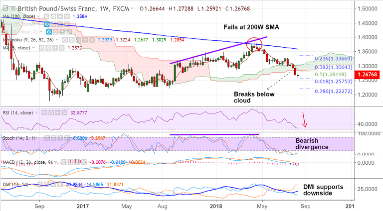 - Technical indicators on weekly charts are heavily bearish. Price action has dipped below weekly cloud, broken below strong trendline support at 1.27.