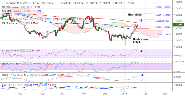 - GBP/CHF trades 0.31% higher on the day at 1.2892 at 1345 GMT, bias bullish.