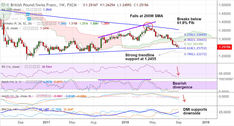 - The pair is extending weakness after being rejected at 200-W SMA. Technical indicators on weekly charts are highly bearish.