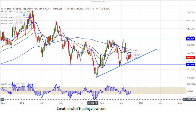 GBPJPY was trading in narrow range between 146 and 144 for past 1-week. The Brexit uncertainty and G20 meeting is putting pressure on the pair. GBP was trading weak against all majors as UK PM May has formally informed that rejection of Brexit deal will lead to no deal scenario. Markets eye Trump and Xi meeting for further direction. If no deal happens after the meeting Japanese yen will gain strength on safe haven asset demand. The pair hits low of 144.52 yesterday and is currently trading around 144.94.