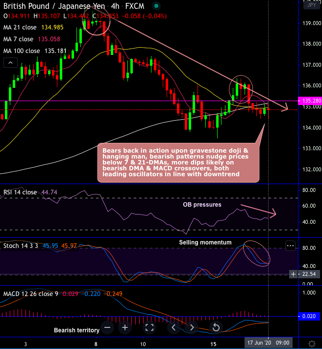 GBPJPY has resumed its bearish business today, even though bulls attempt to make an upside traction yesterday. The pair plunged from the recent peaks of 136.354 to the current 134.442 levels, prior to which it has formed a sharp gravestone doji and hanging man patterns at 139.062 and 135.861 levels respectively.