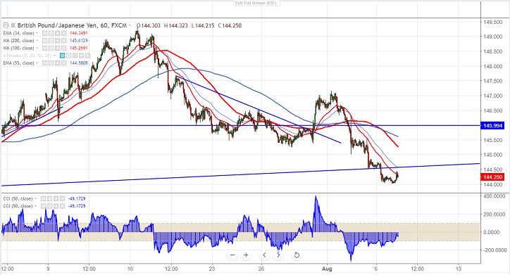 The near term resistance is around 144.60 (55- H EMA) and any break above will take the pair to next level 145/145.61 (200-H MA).