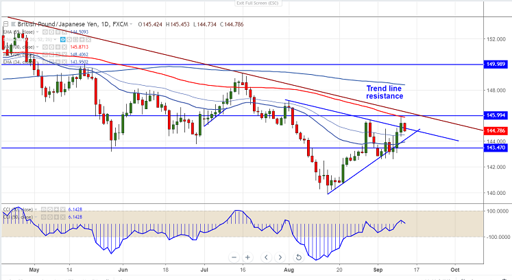 On the lower side, 144.50 (55- day EMA) will be acting as near term support and any break below targets 144.07/143 in the short term.