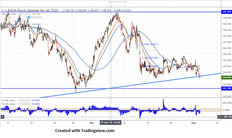 GBPJPY has broken trend support 144.15 after long consolidation for past ten trading session. The Japanese yen is trading strong against all majors after a minor jump on trade truce between US and China. The Brexit uncertainty is also putting pressure on this pair. GBP has declined more than 100 pips against USD yesterday. The pair hits low of 143.95 at the time of writing and is currently trading around 144.07.