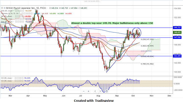 GBPJPY has shown a sell-off of more than 100 pips after hitting high of 149.30. Previously the pair hits high of 149.71 and declined till 147.19. It is almost like double top and any bullishness can be seen only above 150.