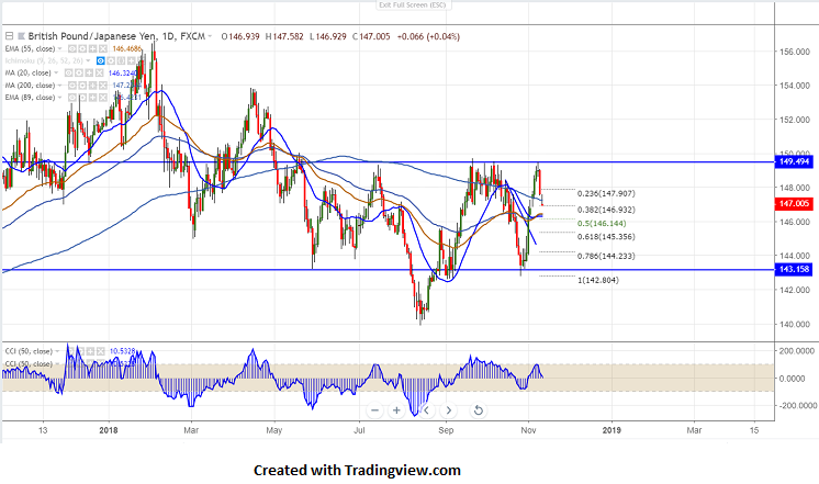 As per our analysis GBPJPY declined sharply more than 250pips after hitting high of 149.48. This is the fourth time crossing above 149 (149.71,149.42,149.51,149.48) and declined from that level. It hits low of 146.92 and is currently trading around 147.18.