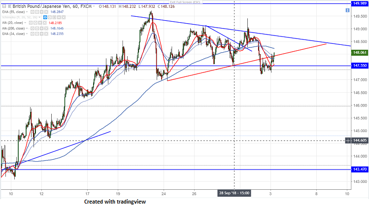 GBP/JPY has shown a minor recovery after a good 250 pips sell off. The slight jump was due to good recovery in GBP especially against USD. The pair hits intraday high of 148.01. It is currently trading around 147.77.