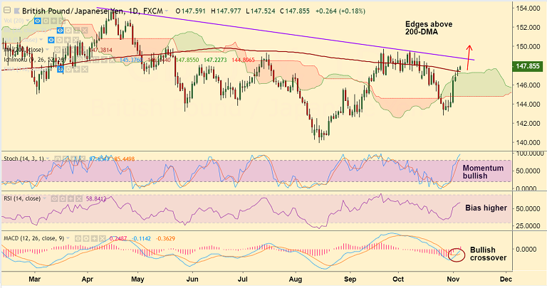 - On the flipside, retrace below 200-DMA could see weakness till 5-DMA at 146.56. Dip below 20-DMA negates bullish bias.