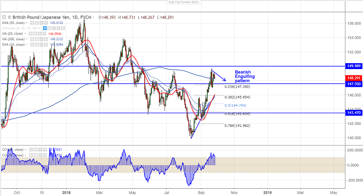 On the lower side, near term support is around 148.20 (200- day MA) and any break below will drag the pair till 147.39 (23.6% fib)/146.94/145.85 (20- day MA).