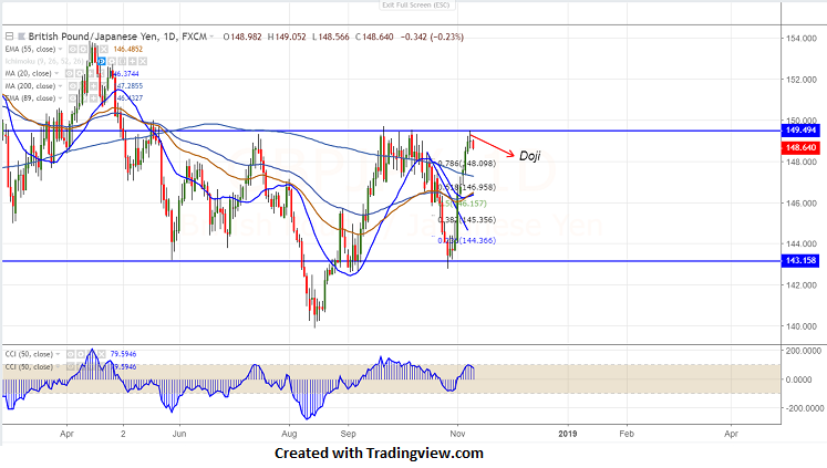GBPJPY has once again declined after hitting high of 149.48. This is the fourth time crossing above 149 (149.71,149.42,149.51,149.48) and declined from that level. It hits low of 148.60 and is currently trading around 148.63.