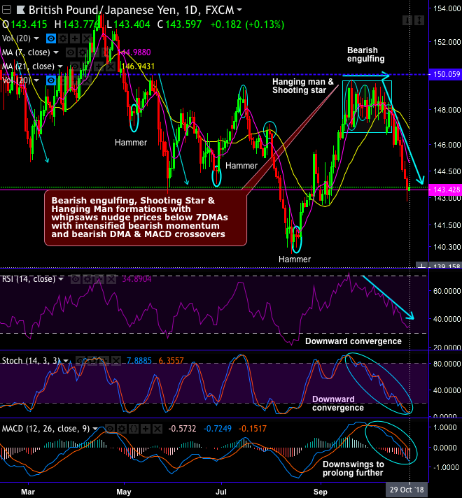 GBPJPY chart and candlestick patterns occurred: On daily plotting, bearish engulfing, shooting star and hanging man patterns have occurred to counter the previous bullish trend. All these candlestick patterns are bearish in nature have occurred at 147.151, 148.528 and 146.754 levels respectively that forms whipsaws on DMAs, one can observe the selling sentiments ever since then.