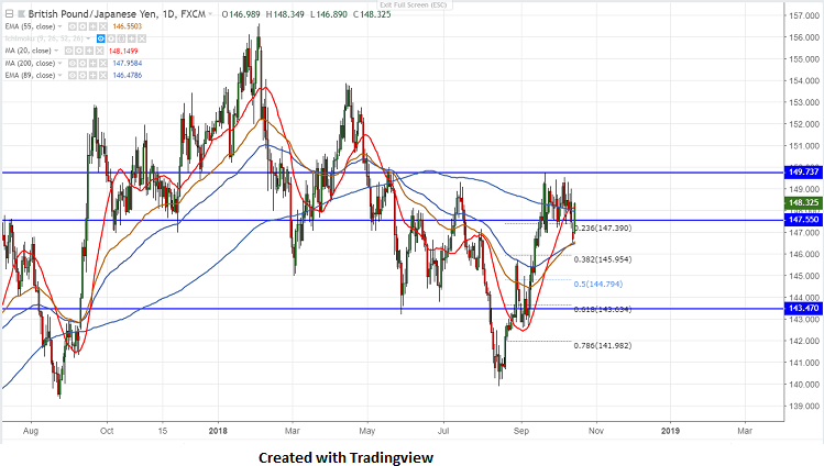 The pair has taken support near 89- day EMA and any close below targets 145/144.30. GBP was trading highly volatile ahead of Brexit summit on Wednesday of this week. UK wage growth inc bonus came at 2.7% fastest pace in 10 years and unemployment rate steady at 4%.The major near resistance is around 148and any beak above targets 149.30/149.70. Any break above 150 confirms that short term selling got completed at 139.89 and new major bullish trend will continue after breaking 150. Any violation above targets 153.75/156.60.