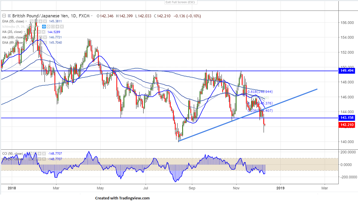 GBPJPY was `trading extremely lower and lost more than 200 pips from high of 143.69 made yesterday. The dip was mainly due to Brexit uncertainty. GBP was trading lower against all majors especially with USD has lost more than 250 pips and hits 20-month low as Brexit deal vote got postponed. Markets eye UK wage growth data which is to be released today for further direction. GBPJPY hits intraday low of 141.17 and is currently trading around 142.23.