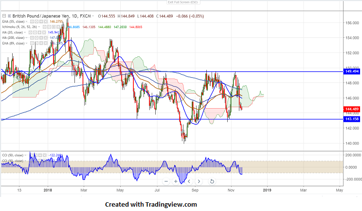 GBPJPY is consolidating after a major sell -off. The pair declined more than 350 pips on account of Brexit uncertainty. UK PM is expected to travel to Brussels today to discuss the trade. Markets eye BOE Governor testimony on inflation report hearings before UK Parliament Treasury Committee today. GBPJPY hits low of 144.24 and is currently trading around 144.98.