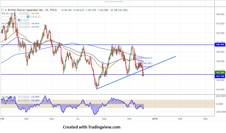 GBPJPY has lost more than 100 pips after breaking minor trend line support at 144. The pair was trading in narrow range for past 10 days. The Japanese yen is trading strong against all majors yesterday due to declining stock markets. The renewed Brexit uncertainty is also putting pressure on this pair. GBP breaks major support has declined more than 100 pips against USD yesterday. The pair hits low of 142.84 yesterday and is currently trading around 143.47.