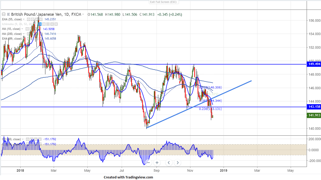 GBPJPY has recovered slightly of more than 150 pips from low of 141.17 on account of broad based weakness in JPY. But Brexit uncertainty is putting pressure on this pair. GBP was trading lower yesterday amid better than expected wage growth. German Merkel has rejected UK PM May plan for renegotiation of Brexit deal. Markets eye EU Brexit summit on Thursday for further direction. GBPJPY hits high of 142.95 and is currently trading around 141.90.