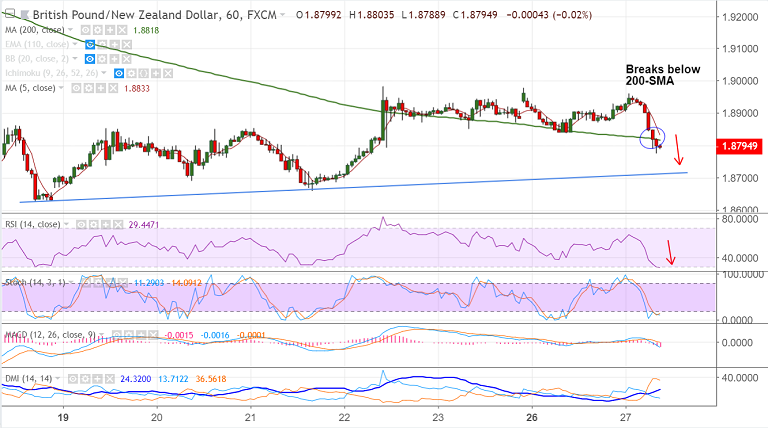 - GBP/NZD has broken support at 1H 200 SMA at 1.8818, bias bearish.