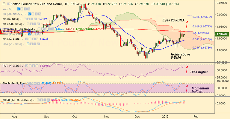 - GBP/NZD holds above 5-DMA support, trades 0.09% higher on the day at 1.9161 at 0630 GMT.