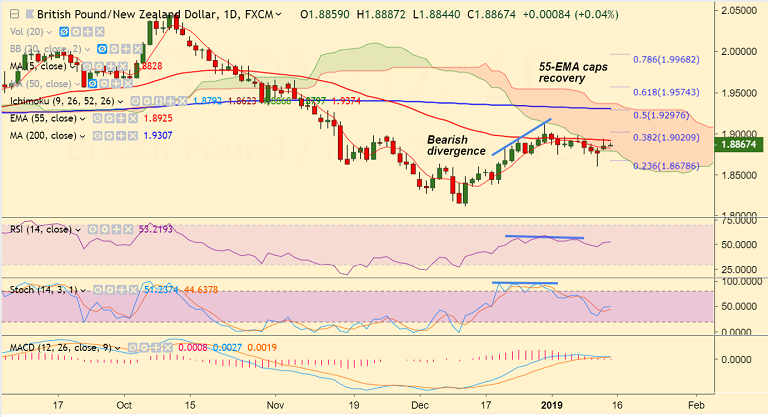 - The pair trades with a bearish bias and recovery attempts capped at 55-EMA.