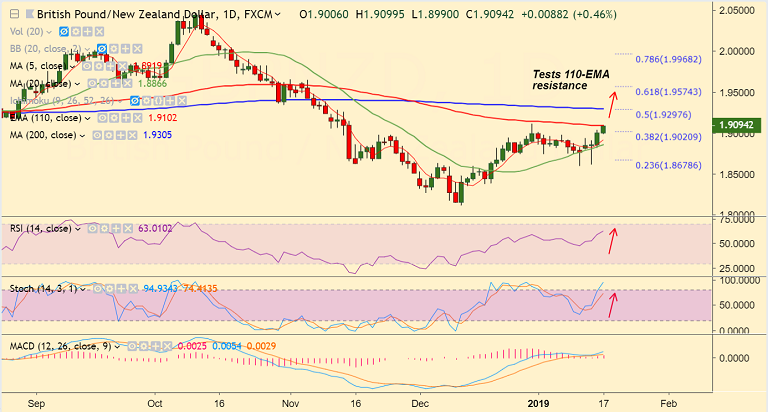 - The pair has tested resistance at 110-EMA at 1.9102, break above to see further gains.