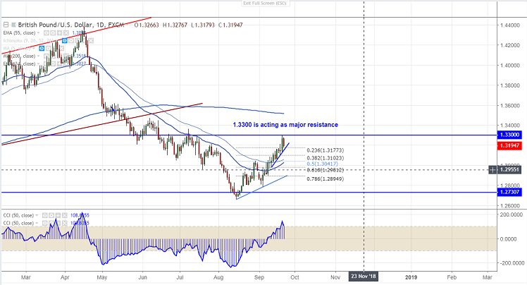 GBPUSD halted its continuous bullishness after a jump of more than 150 pips yesterday. The recent jump was mainly due to Brexit optimism and better than expected UK economic data. The pair hits high of 1.32983 and shown a good sell-off after EU top officials said UK Brexit will not work. In the Brexit meeting in Salzburg Austria, the EU council president Tusk and Juncker has said that Theresa May Chequers plan is unworkable. It has announced potential summit in November. The pair hits low of 1.31949 and is currently around 1.32085.