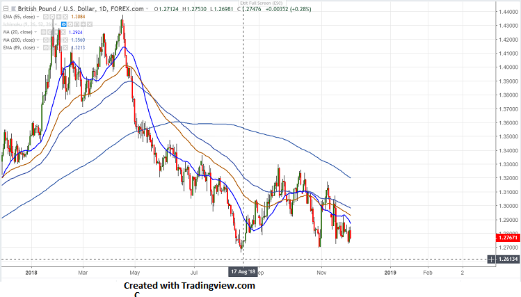 GBPUSD has shown a decline after a minor recovery from the low of 1.2725. Prices rebounded from the key support 1.2660-1.270.The pair has recovered sharply till 1.28495 after Fed Chairman Powell dovish statement. Cable pared all its gains on Brexit uncertainty.EU chief Brexit negotiator said that Brexit deal on table is the only deal possible. The pair hits intraday low of 1.27556 and is currently trading around 1.27640.Markets eye US Fed meeting minutes for further direction.