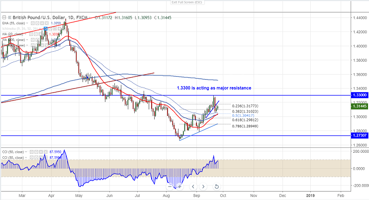 GBP/USD halted its bearishness after a huge sell-off of more than 200 pips on Sep 21st 2018 after top EU officials rejected Theresa May chequer Brexit plan. The pair has recovered almost 100 pips from the low of 1.30556. The slight recovery was due to positive commnets from Brexit minister Raab. German Chancellor Angela Merkel said that an agreement about Brexit could come in Oct. With no major economic data in UK markets eye US consumer confidence and fed monetary policy.