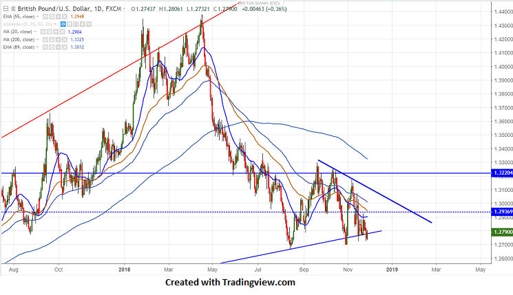 GBPUSD has recovered slightly more than 80 pips from low of 1.27250 made yesterday after UK Chancellor Hammond suggested there will be Norway type of deal if Theresa’s May’s plan is blocked by parliament.The pair has lost almost pips in past three trading session on account of Brexit uncertainty, and trade tensions between US and China. The pair hits intraday high of 1.28061 and is currently trading around 1.27940.
