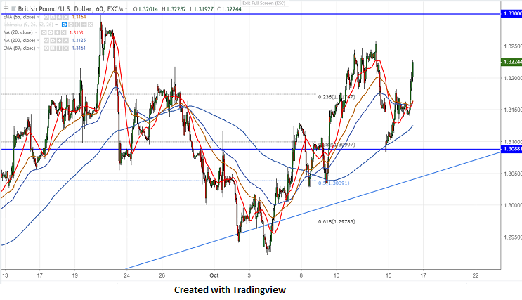 GBP/USD jumps sharply more than 30 pips after release of UK jobs data. The pair hits high of 1.32282 and is currently trading around 1.32217. UK wage growth inc bonus came at 2.7% fastest pace in 10 years and unemployment rate steady at 4%. Markets eye EU Brexit working dinner tomorrow for further major movement.