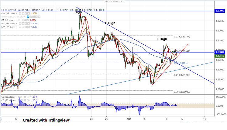 GBP/USD is showing minor sell-off after hitting high of 1.31328. The pair is trading highly volatile on account of Brexit uncertainty. UK Brexit Secretary Dominic Raab has cancelled his next round of Brexit talks in Brussels. UK GDP growth for year 2019 has lowered by IMF to 0.2% is also putting minor pressure on Pound sterling. The pair hits low of 1.30282 and is currently trading around 1.30762.