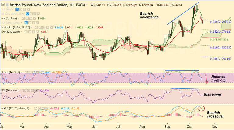 - GBP/NZD is extending weakness for the 5th straight session, trades 0.31% lower on the day at 1.9954 at the time of writing.