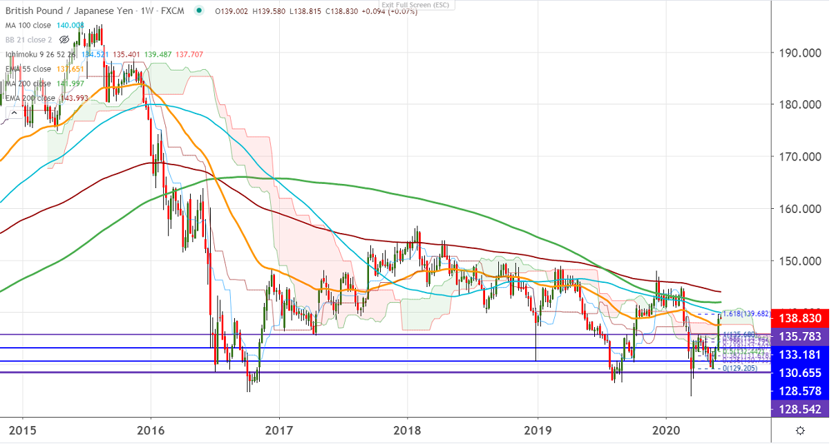 GBPJPY was trading higher for 3rd consecutive week and jumped more than 600 pips on weak yen. The increase of risk appetite in markets has decreased demand for Safe-haven assets like the gold, yen. USDJPY hits 2- month high at 109.84 and facing strong resistance at 200-W MA. Any break above 109.84 confirms further bullishness.