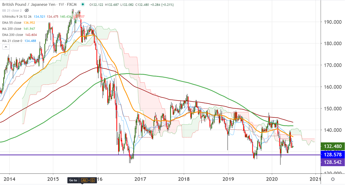 GBPJPY has shown a minor jump from a low of 131.75 till 132.68 on a slight jump in Pound sterling. GBP recovered till 1.23895 on hopes of stimulus from Government and face to face Brexit talks. The weekly trend is slightly on the lower side as long as resistance 134 holds. It is currently trading around 132.36.